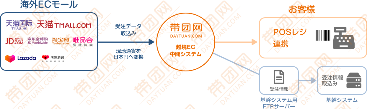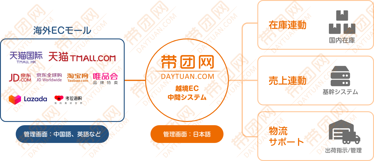 越境EC(TmallGlobal/JD/タオバオなど)の在庫管理や国内システムとの連携、基幹システム(会計)連動、海外発送の物流サポートや国内外の提携旅行代理店間の空室データ連動など国内と海外のECや各種データをつなぐシステム開発に実績があります。 御社の運用にあわせたシステムカスタマイズも承っておりますのでお気軽にご相談ください。 |