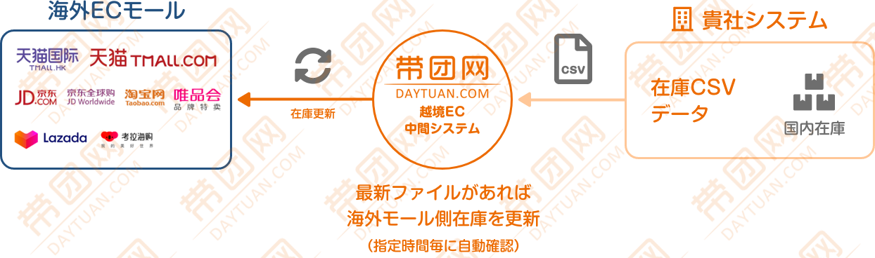 ❶ クライアント様が作成する在庫用CSVを越境EC中間システムのサーバーにアップロード ❷ 越境EC中間システム側で最新ファイルがあれば海外モールの在庫を更新(指定時間おき) ※越境EC中間システムの管理画面から個別修正・海外モール在庫の更新も可能 |